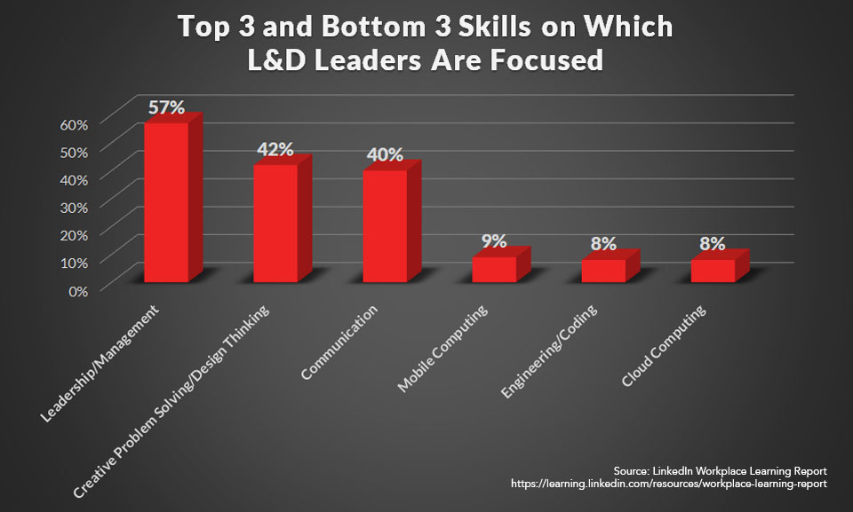 LinkedIn’s report also identified the highest and lowest priority skills that L&D professionals were focused on developing. Soft skills like leadership management (57 percent), creative problem solving/design thinking (42 percent) and communication (40 percent) topped the list. Hard skills like mobile computing (9 percent), engineering and coding (8 percent) and cloud computing (8 percent) rated far lower.