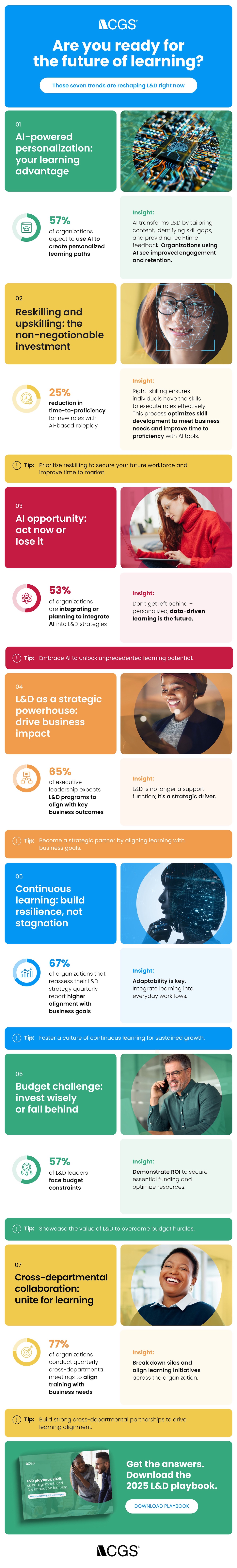 Want the highlights from the 2025 L&D Playbook at a glance? This easy-to-scan infographic breaks down the top seven trends reshaping workplace learning—from AI-powered personalization to strategies for measurable ROI. The fast track to inspiration includes compelling stats, actionable tips, and expert insights to help you stay ahead in the fast-changing world of learning and development. Download the full infographic as a PDF for quick reference.