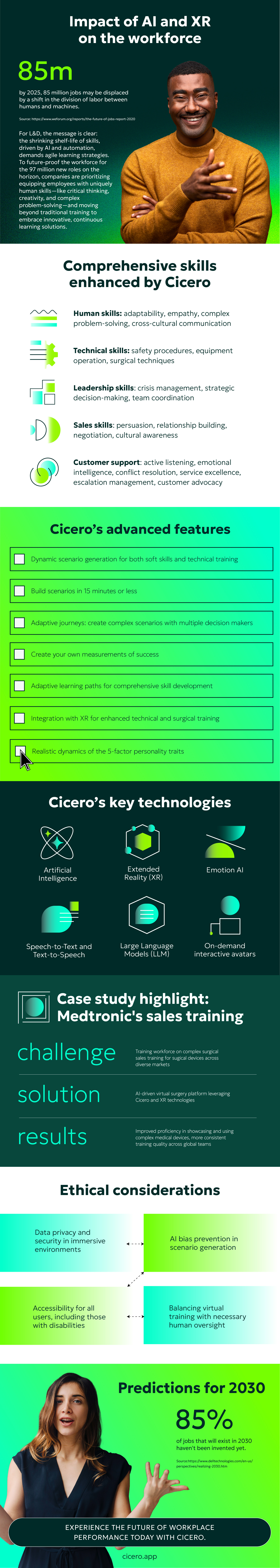 This infographic explores The Cicero Advantage, a lifelike roleplay training platform to build your team's confidence in any workplace interaction. Discover how Cicero can futureproof your workforce with the essential human skills needed to thrive in a rapidly changing world.