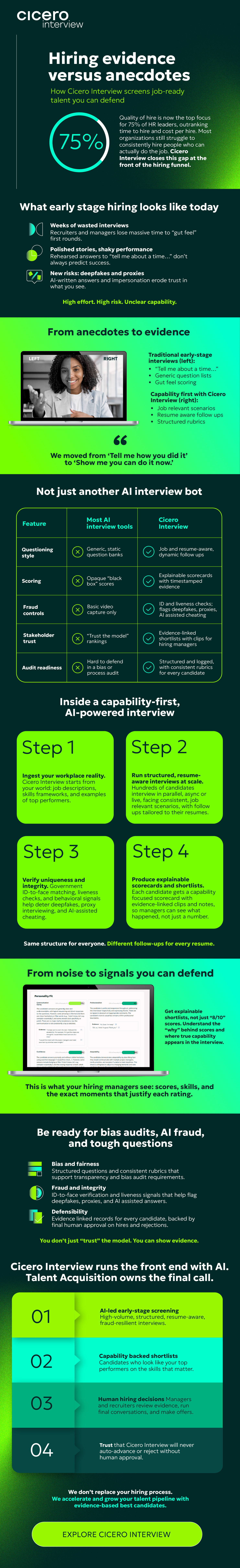 This infographic breaks down how Cicero Interview combines resume-aware AI, fraud-resilient checks, and explainable scorecards to deliver shortlists you can defend to managers and regulators alike.