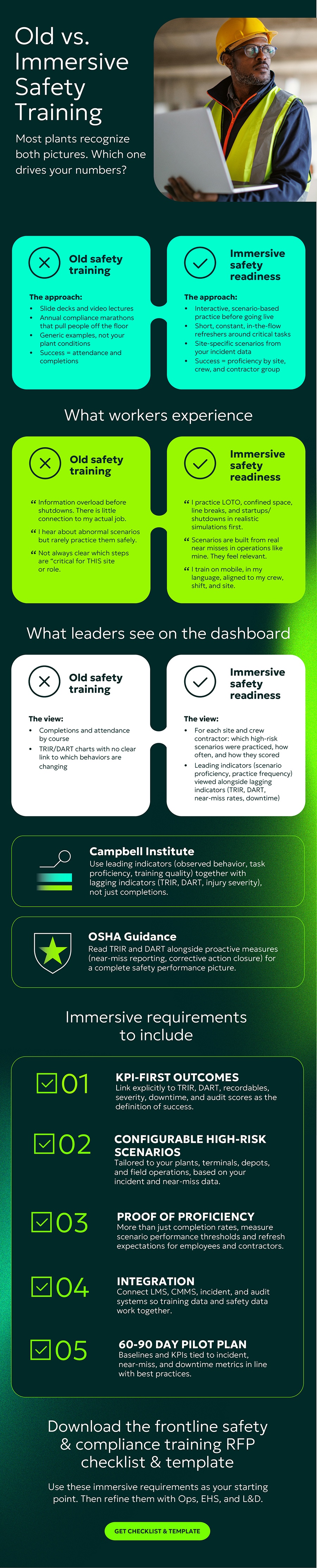 The teams getting ahead of this are shifting to an immersive readiness model—designing training around highest-risk tasks and abnormal situations, building scenarios from actual near-miss data, and expecting partners to show proficiency by site, crew, and contractor group.